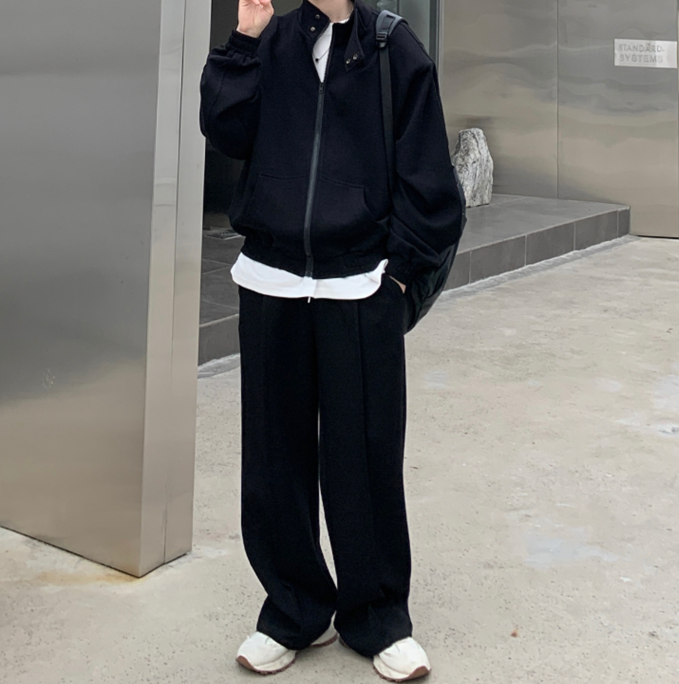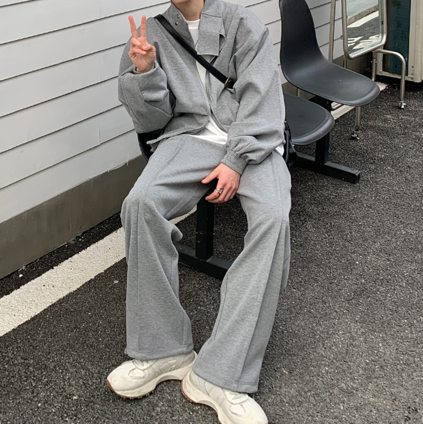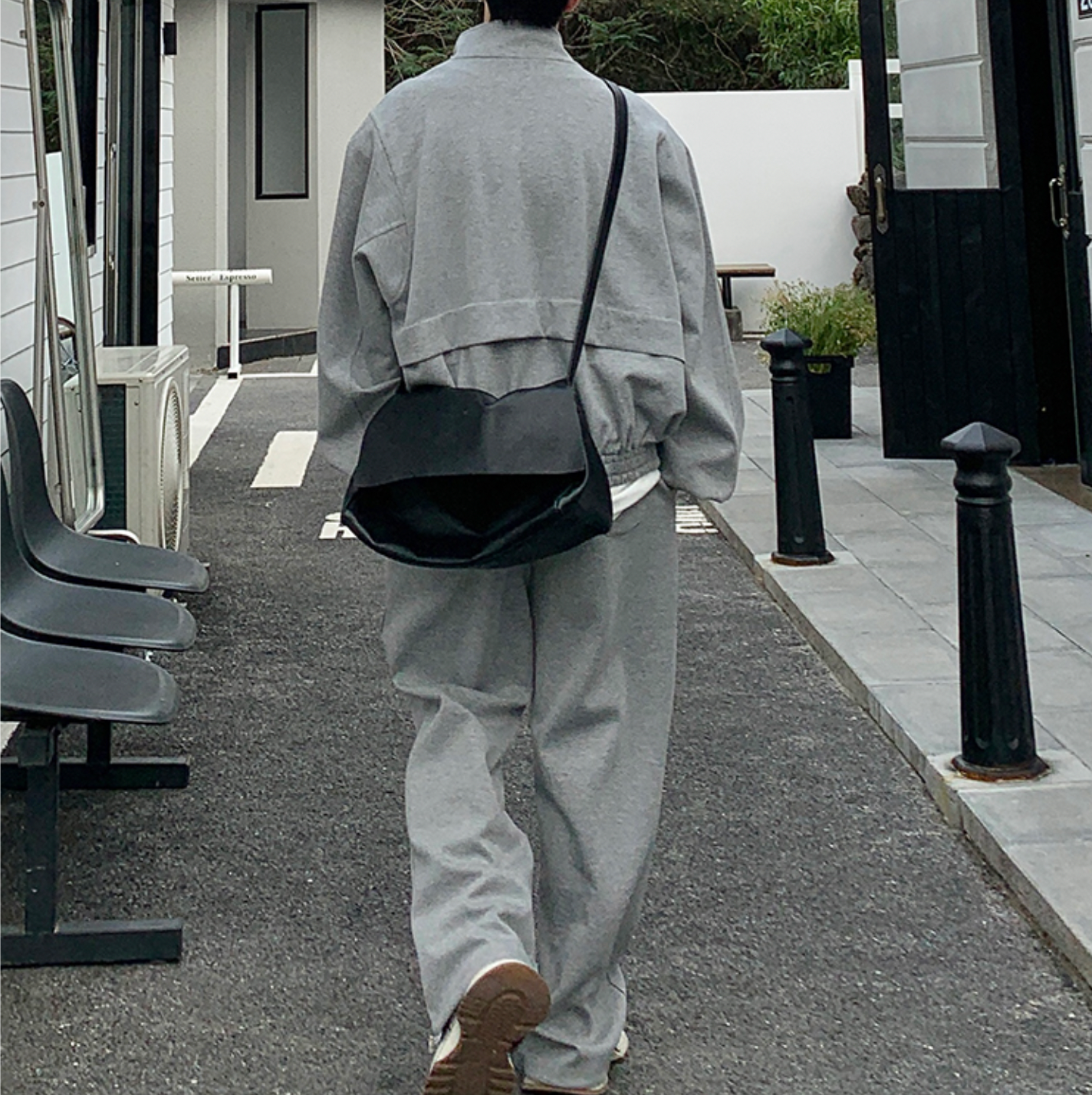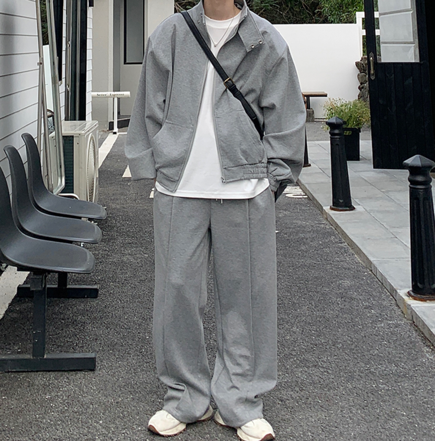 程よいゆるさのシルエットと袖とパンツのセンターに入ったタックが、ダル着に見えさせないポイント。