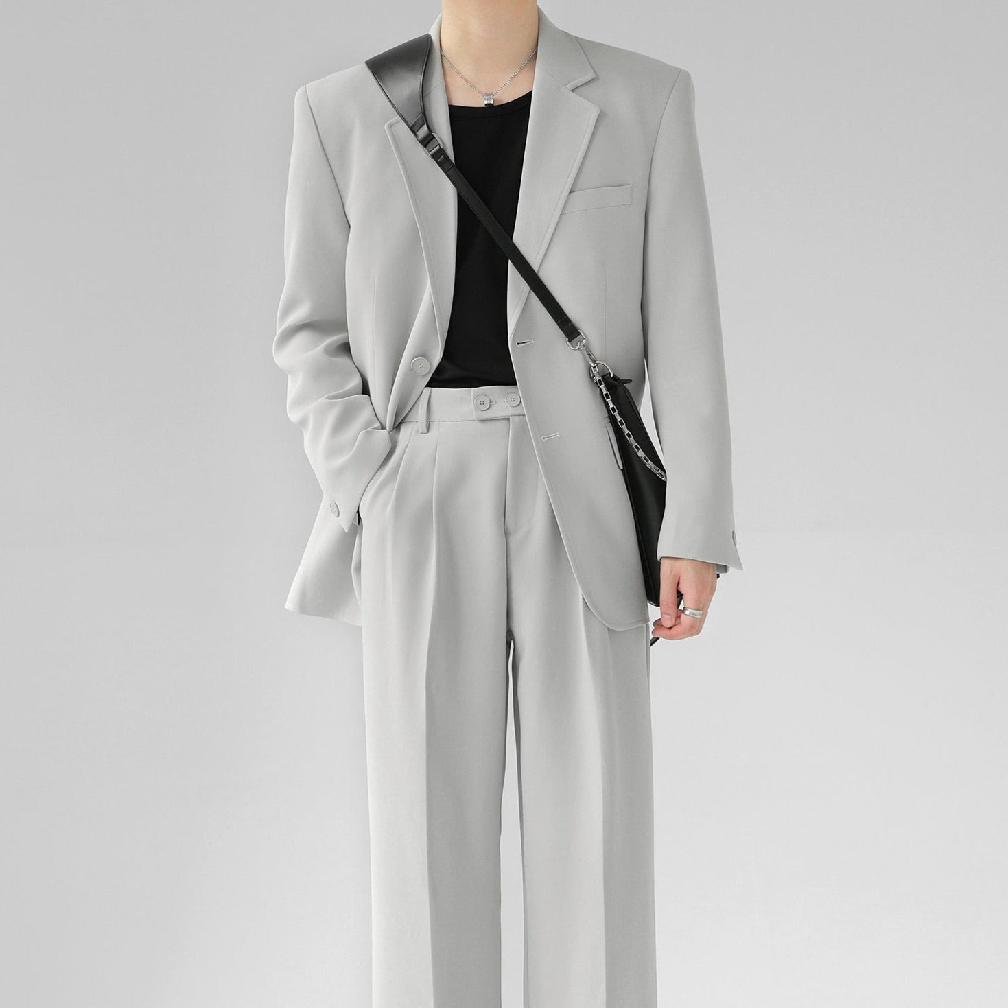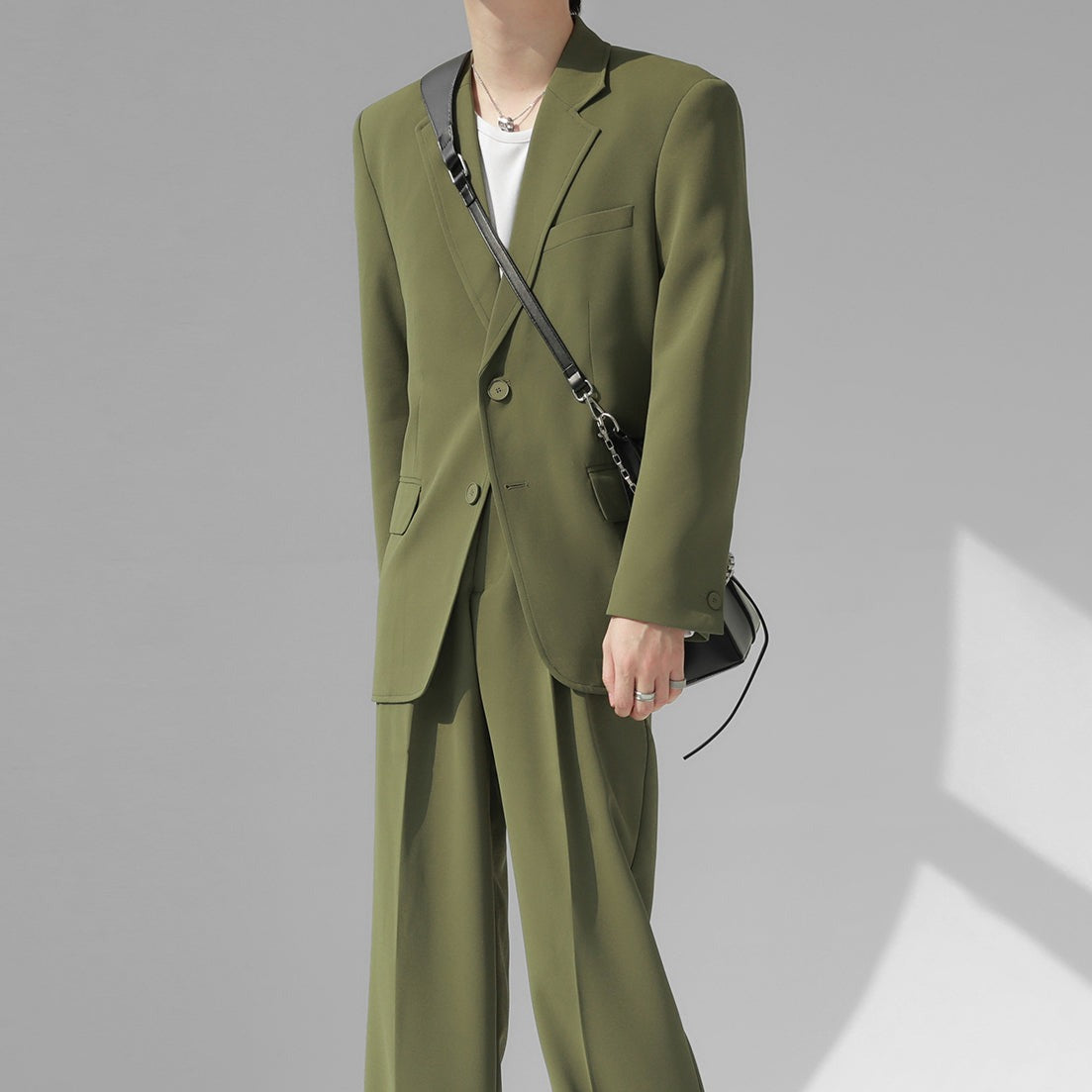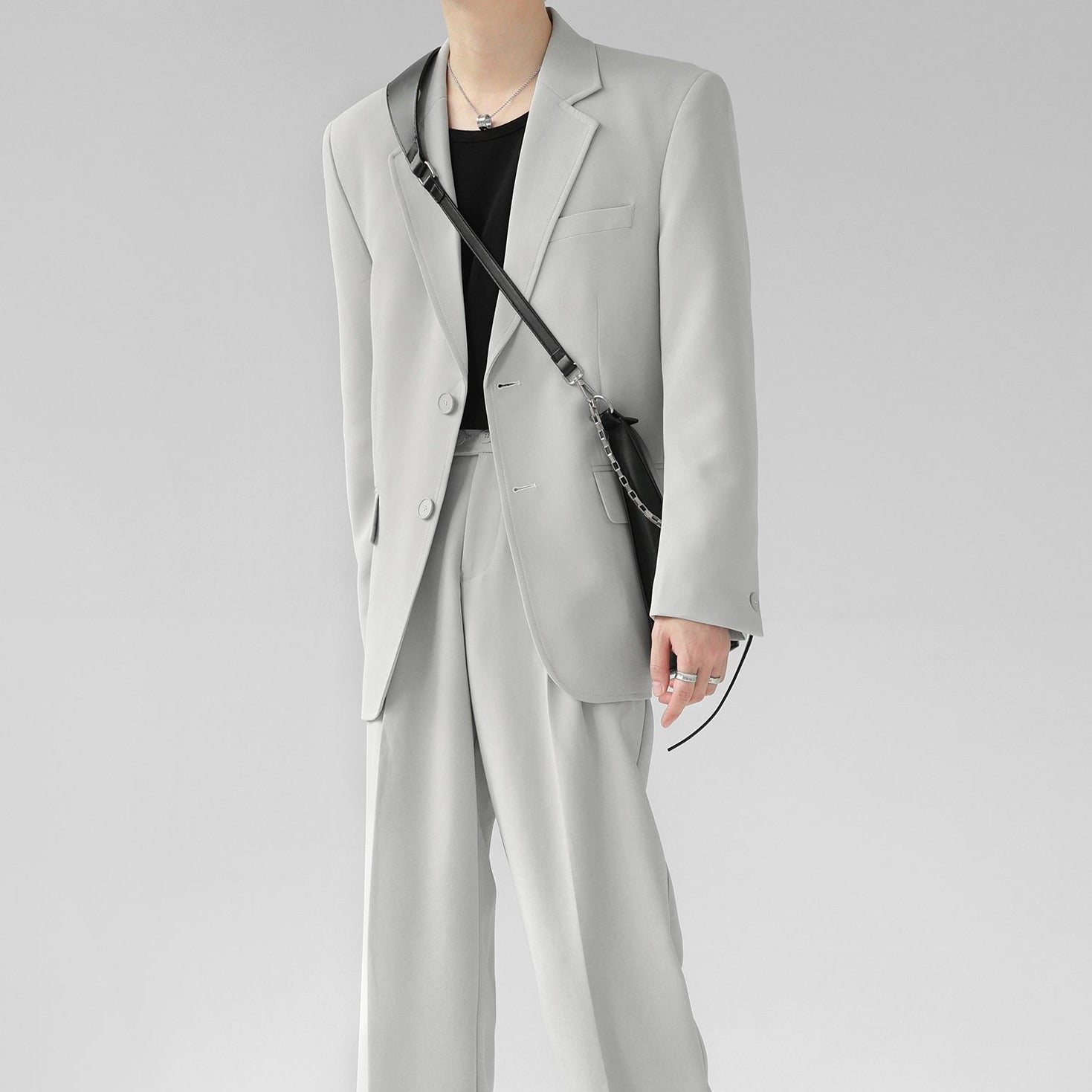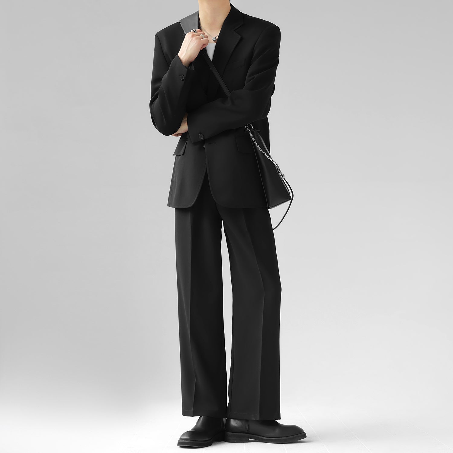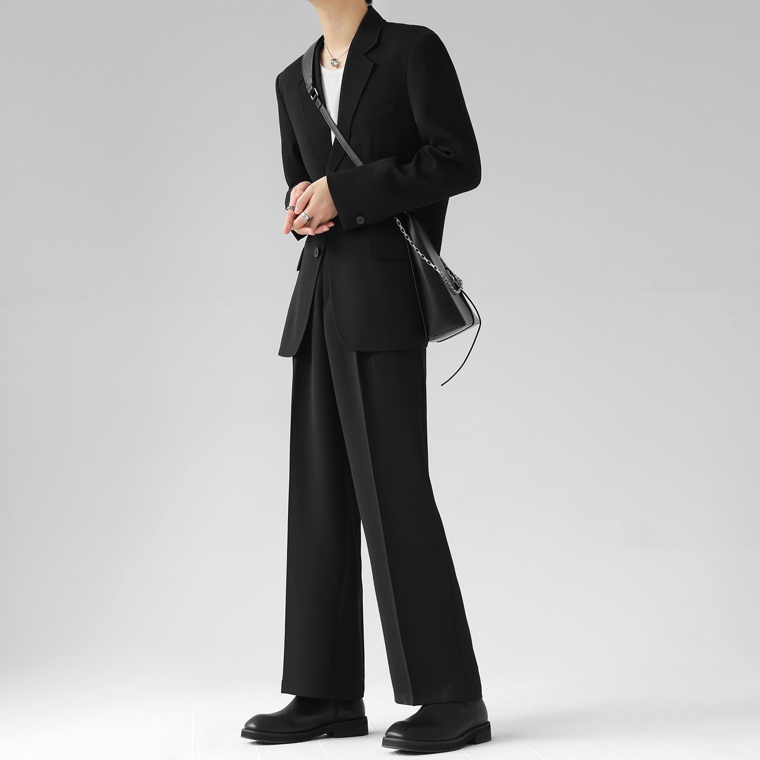 高級感溢れるシンプルなスリムセットアップ。