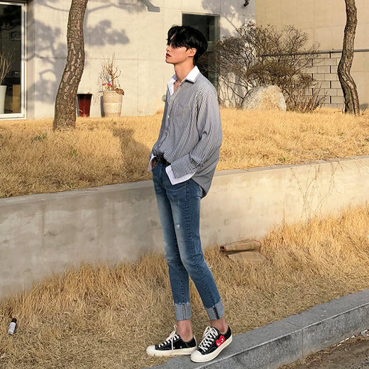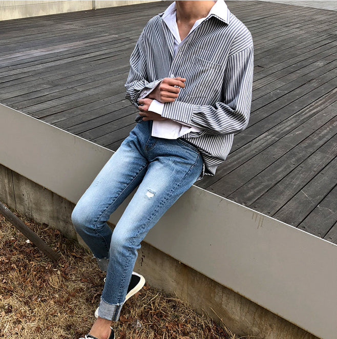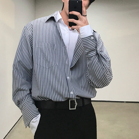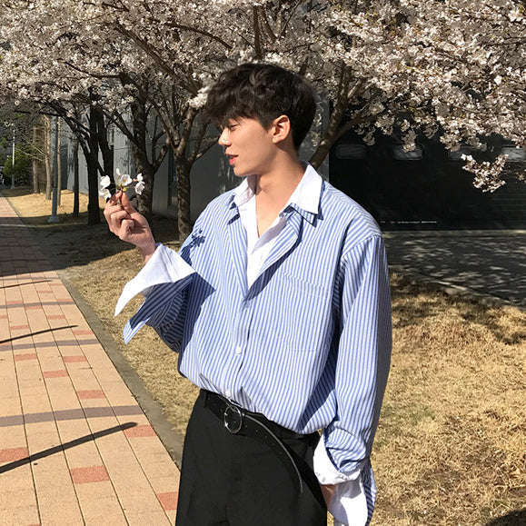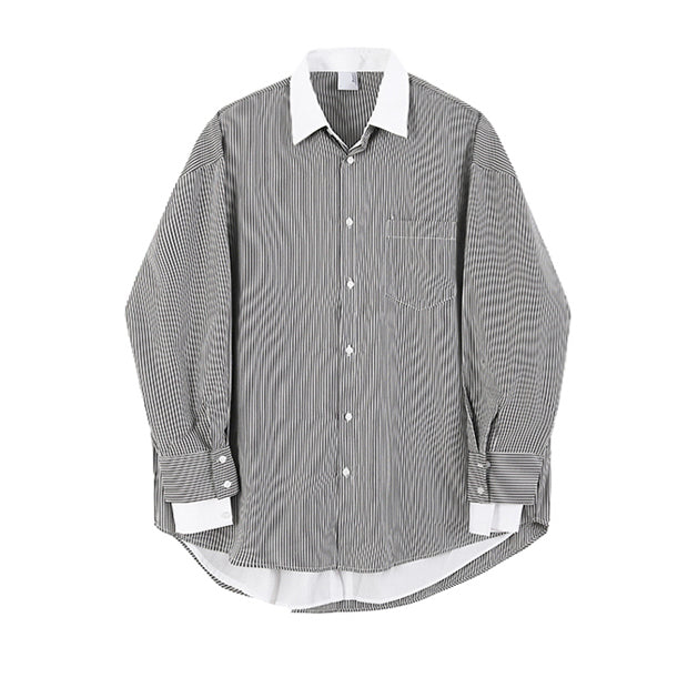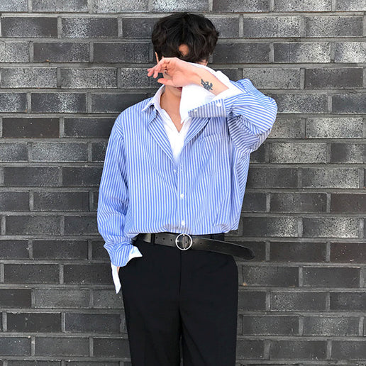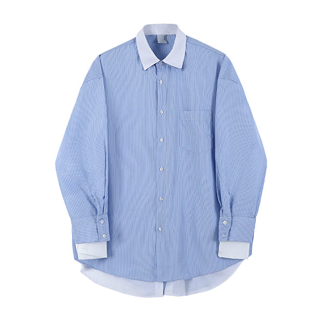 シャツとストライプ柄がドッキングしたレイヤードストライプシャツ。