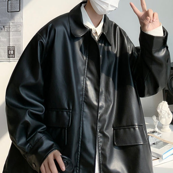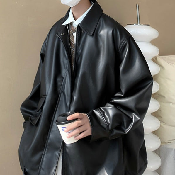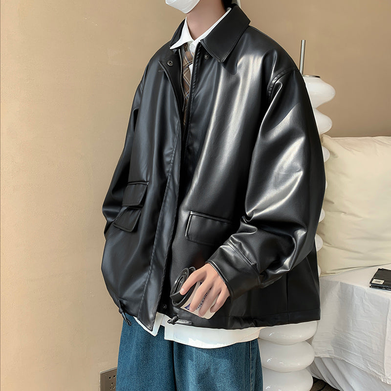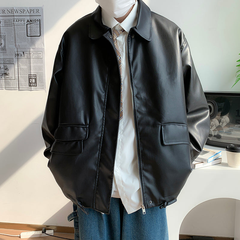 The loose silhouette of this item gives a sophisticated look to your outfit. It's made of leather but is not too formal, making it a simple and versatile outerwear piece.
