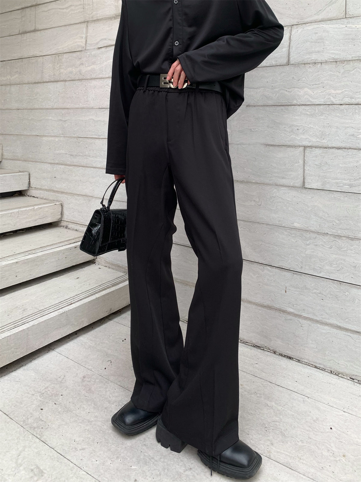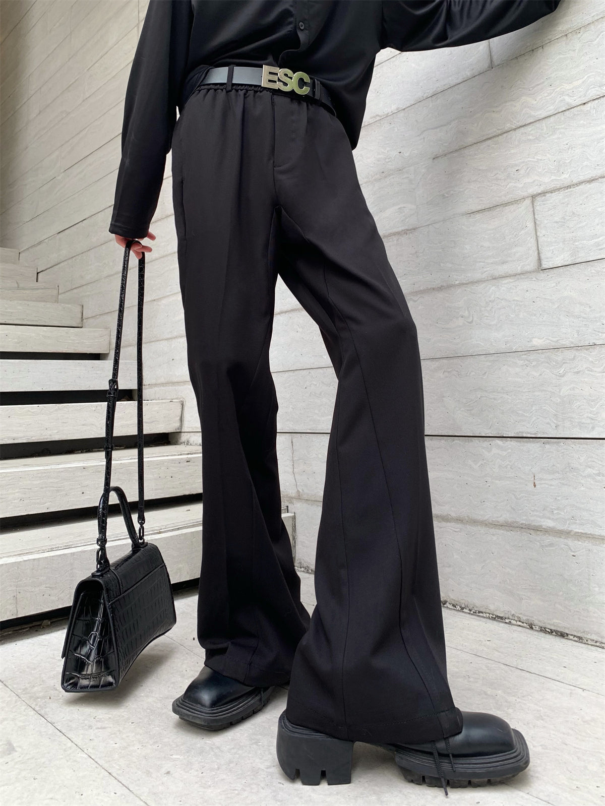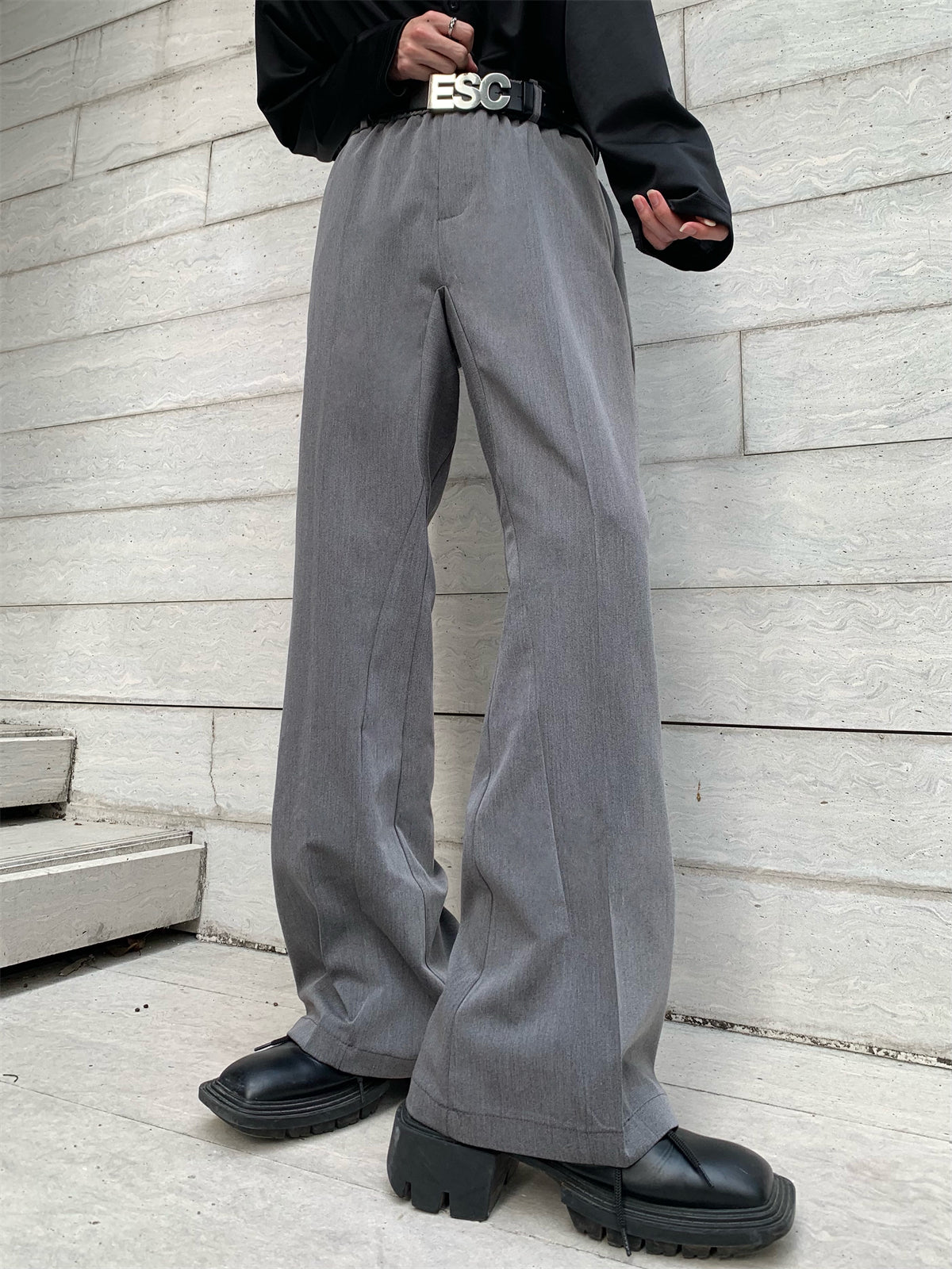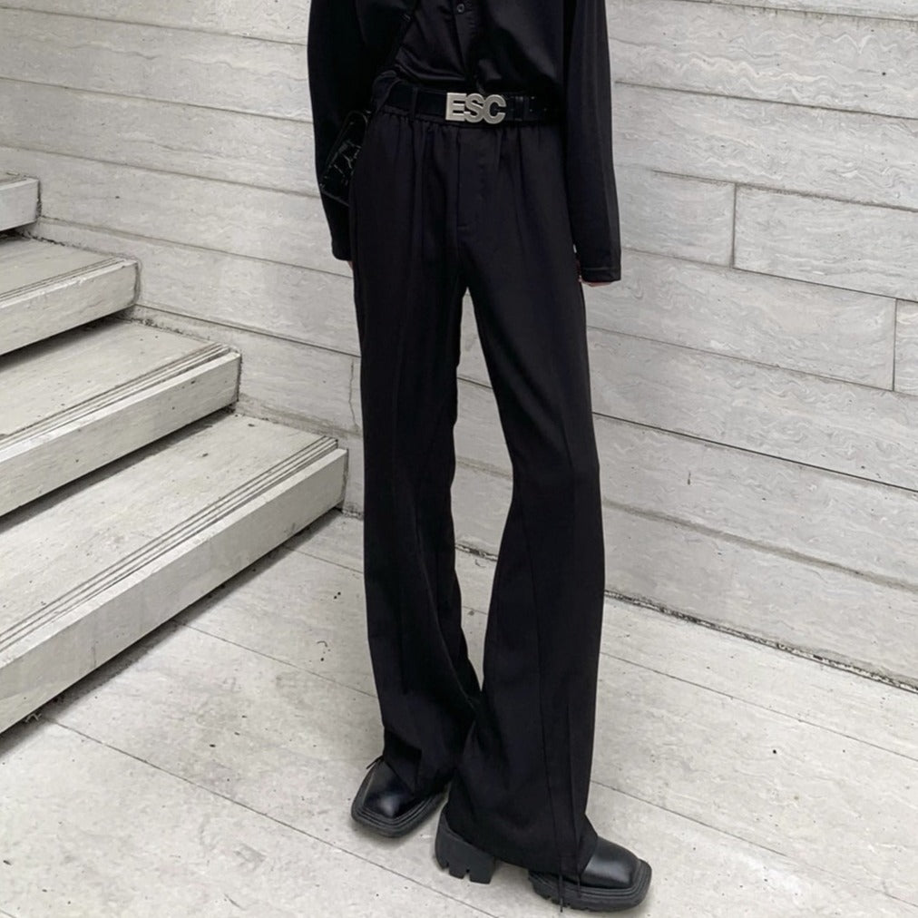 Flared slacks with a silhouette that widens from below the knee to the feet.