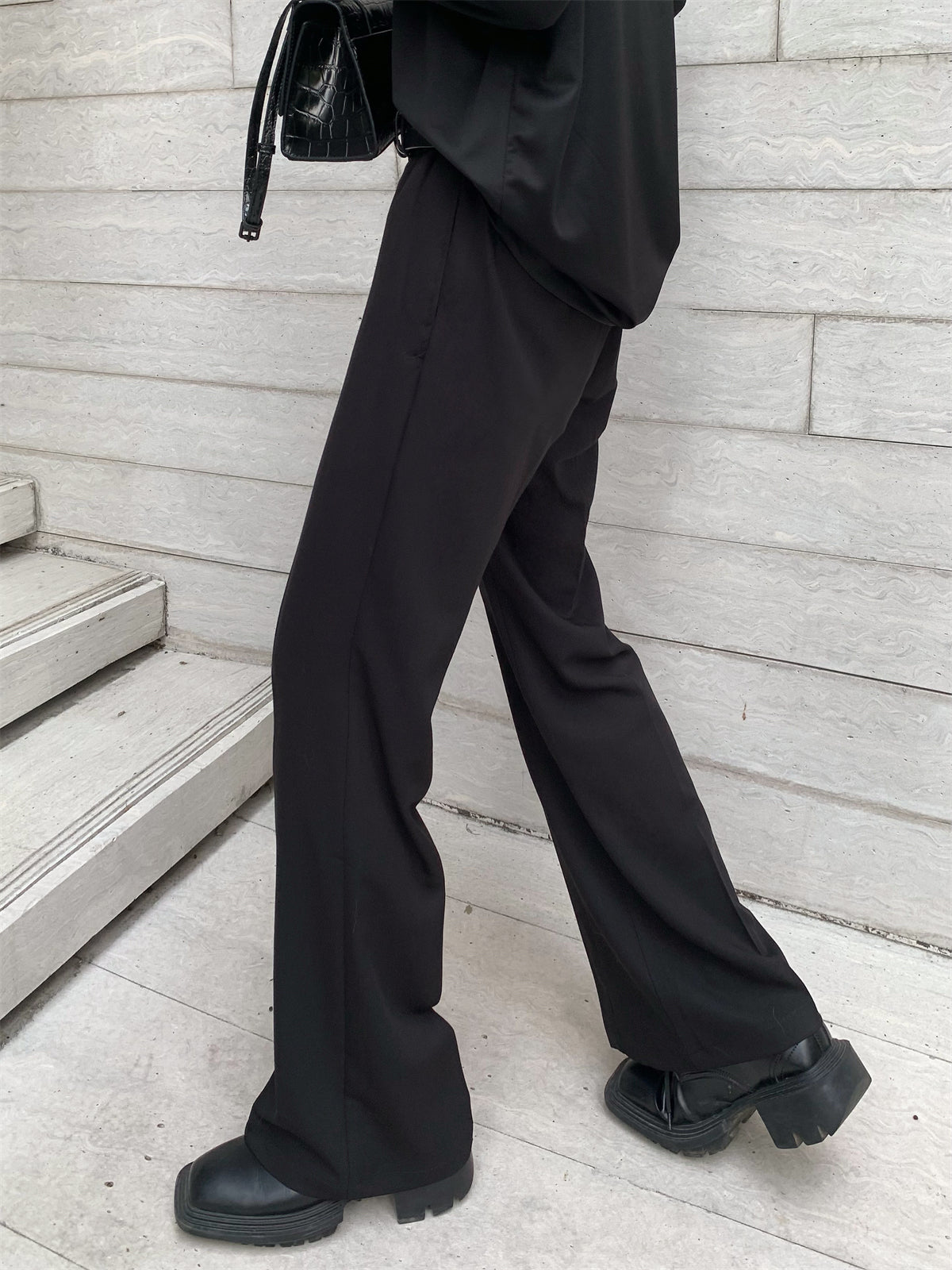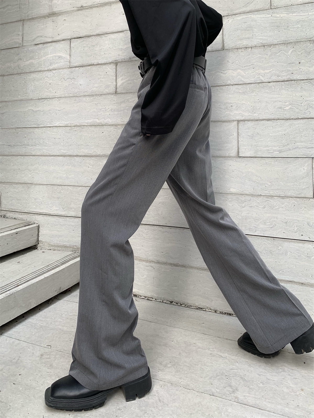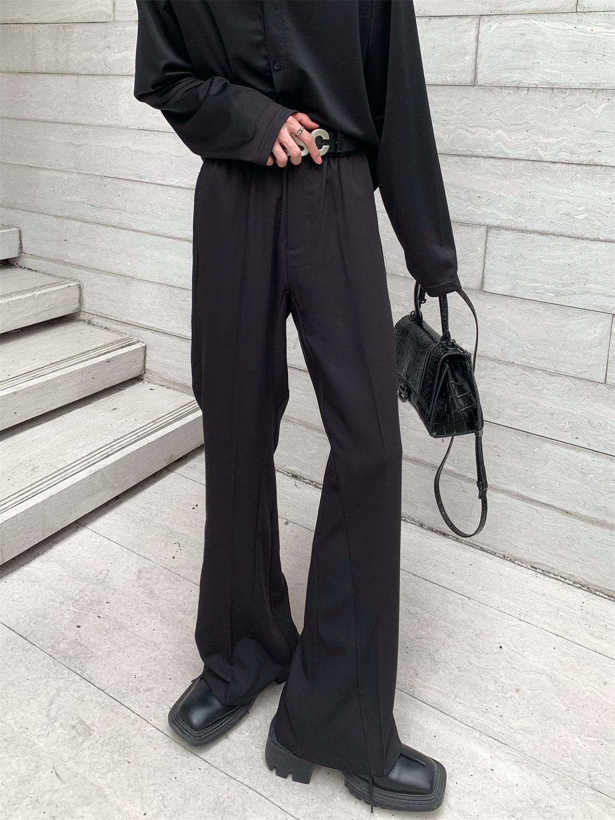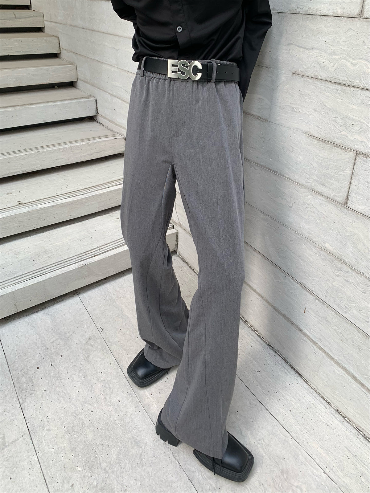 Flared slacks with a silhouette that widens from below the knee to the feet.