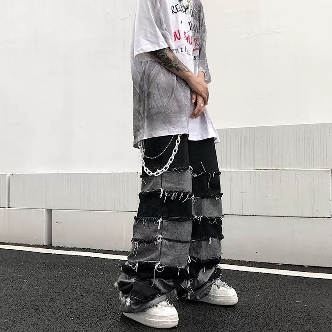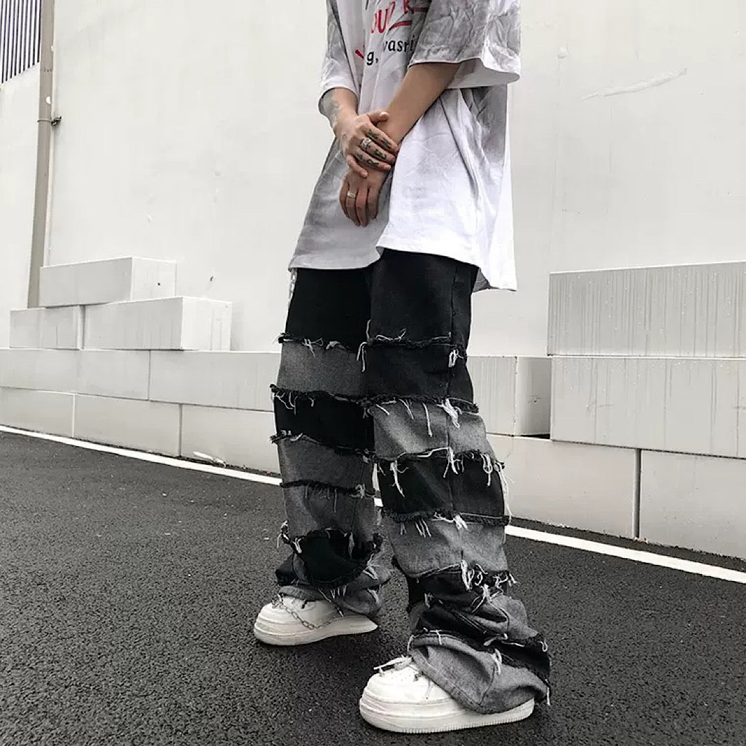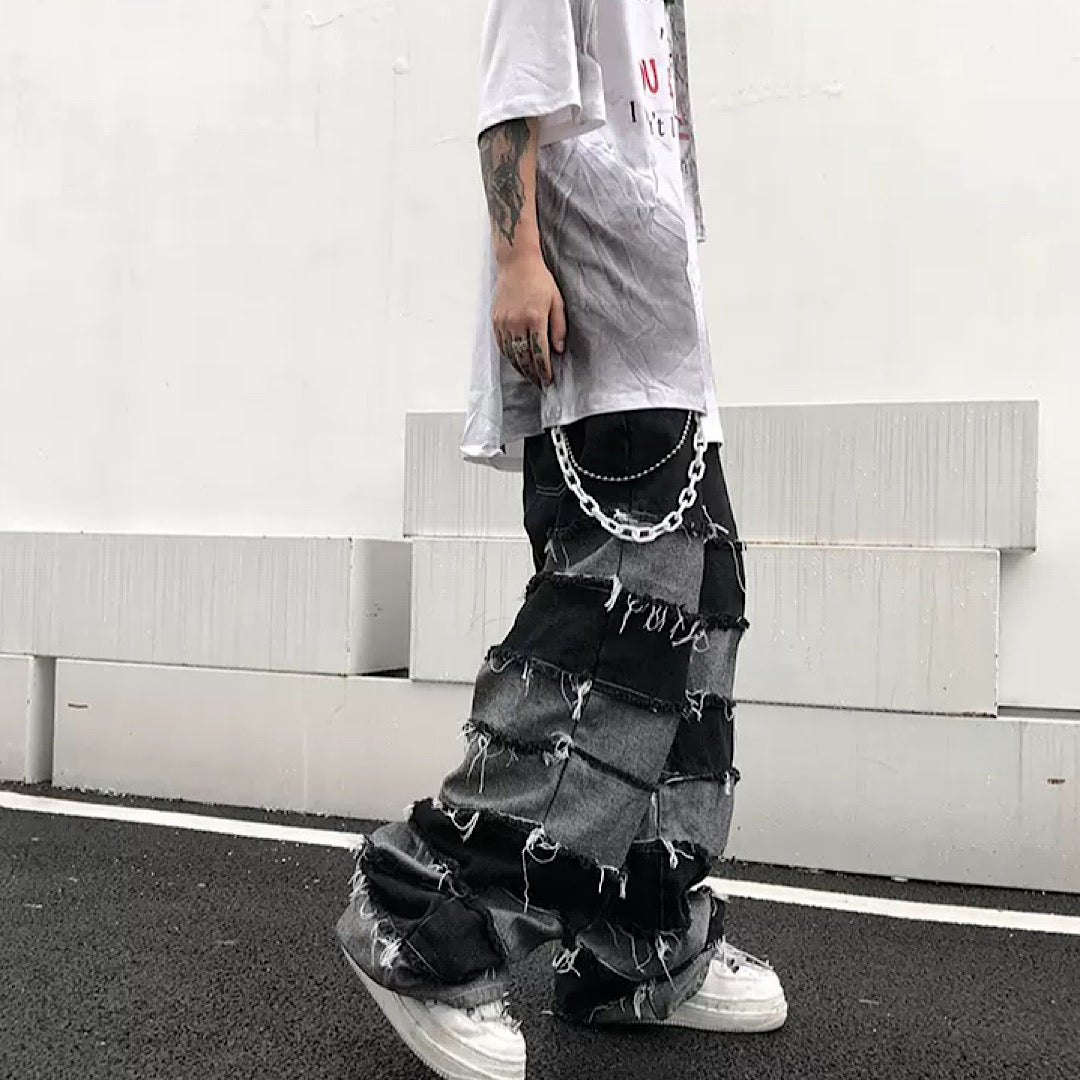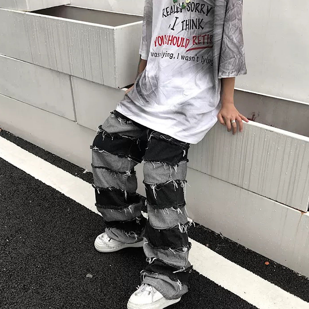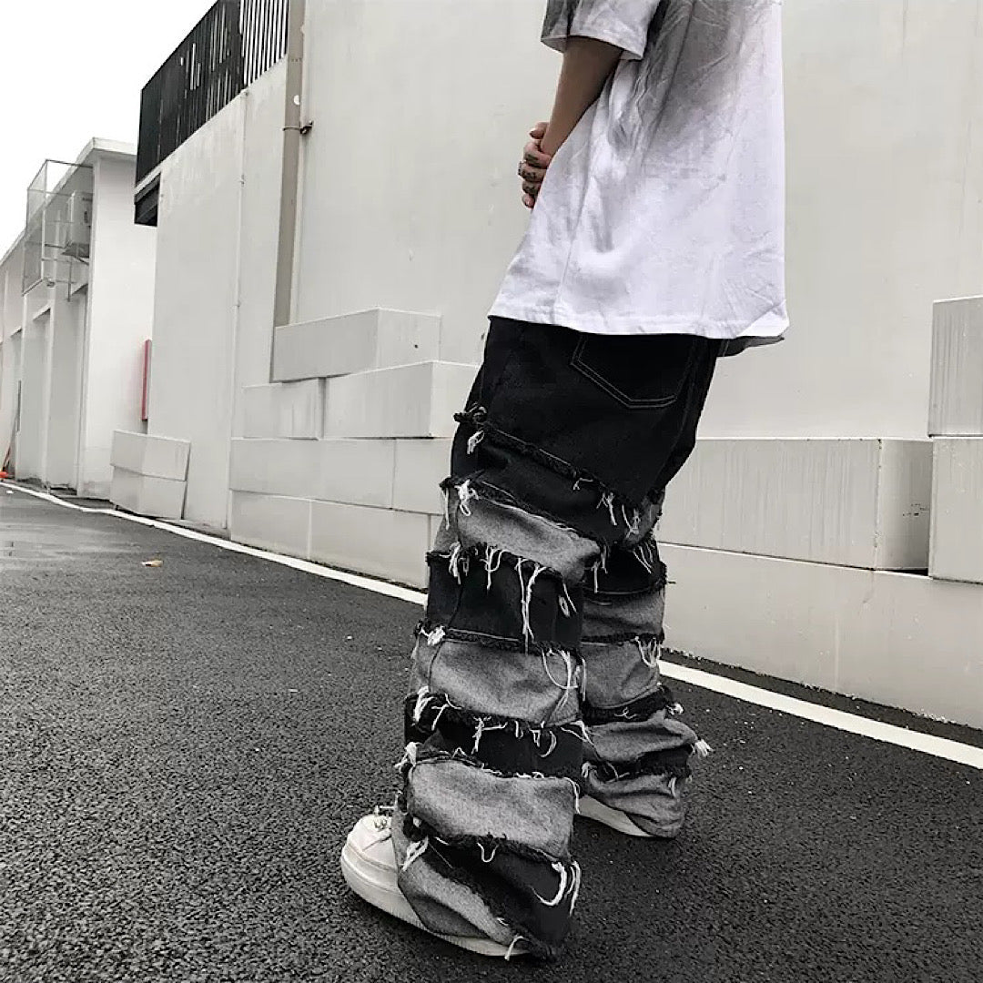 Distressed jeans with two different colored fabrics attached.
