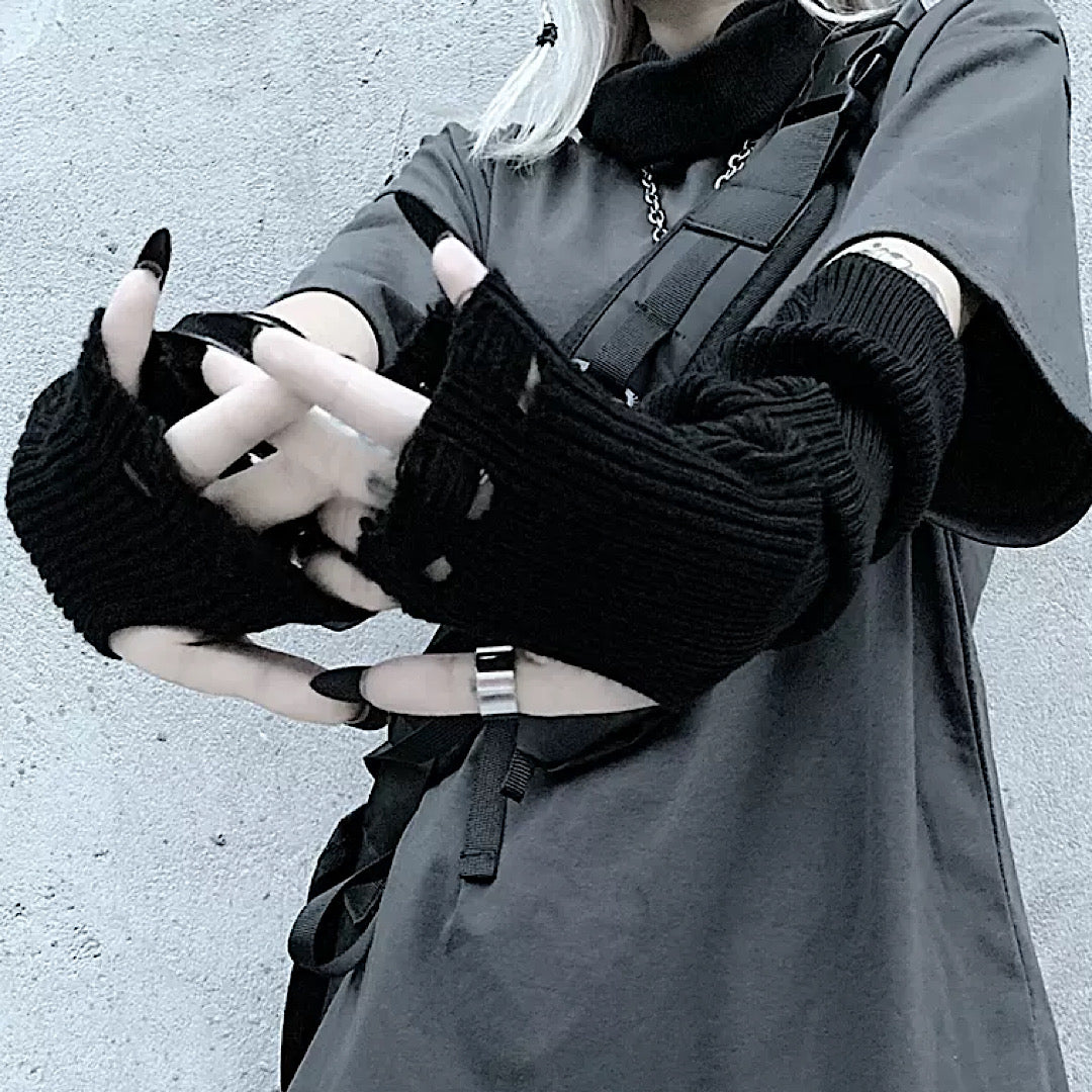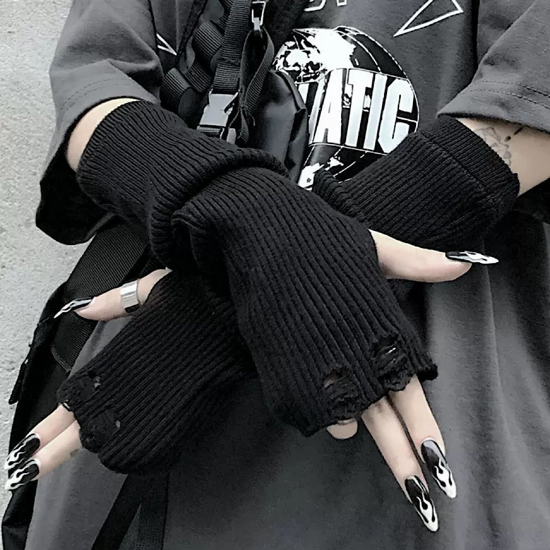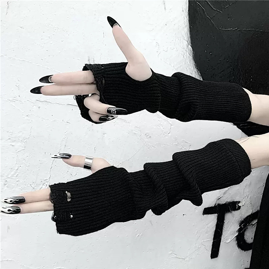 Distressed arm warmers are a must-have item when your hands feel bare.