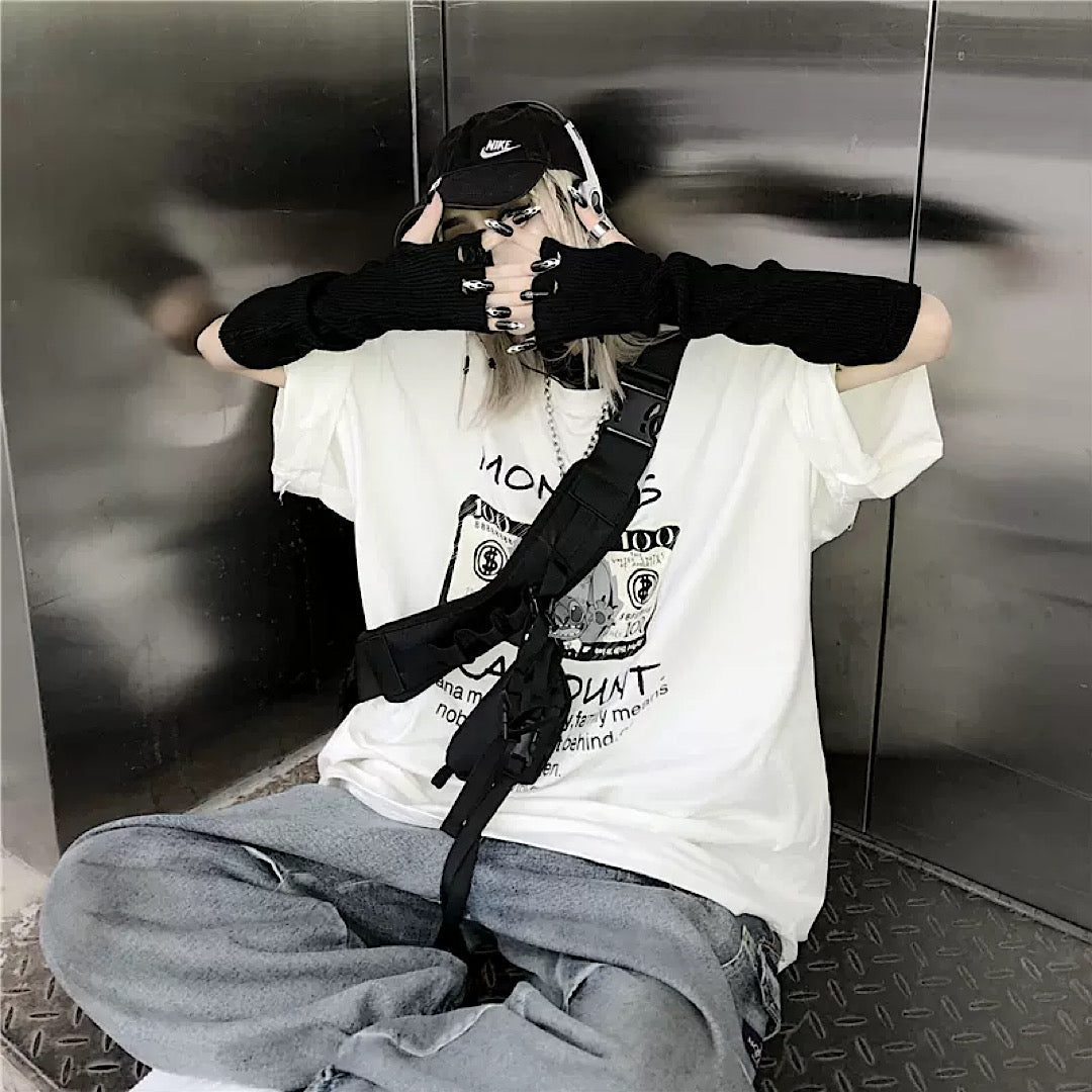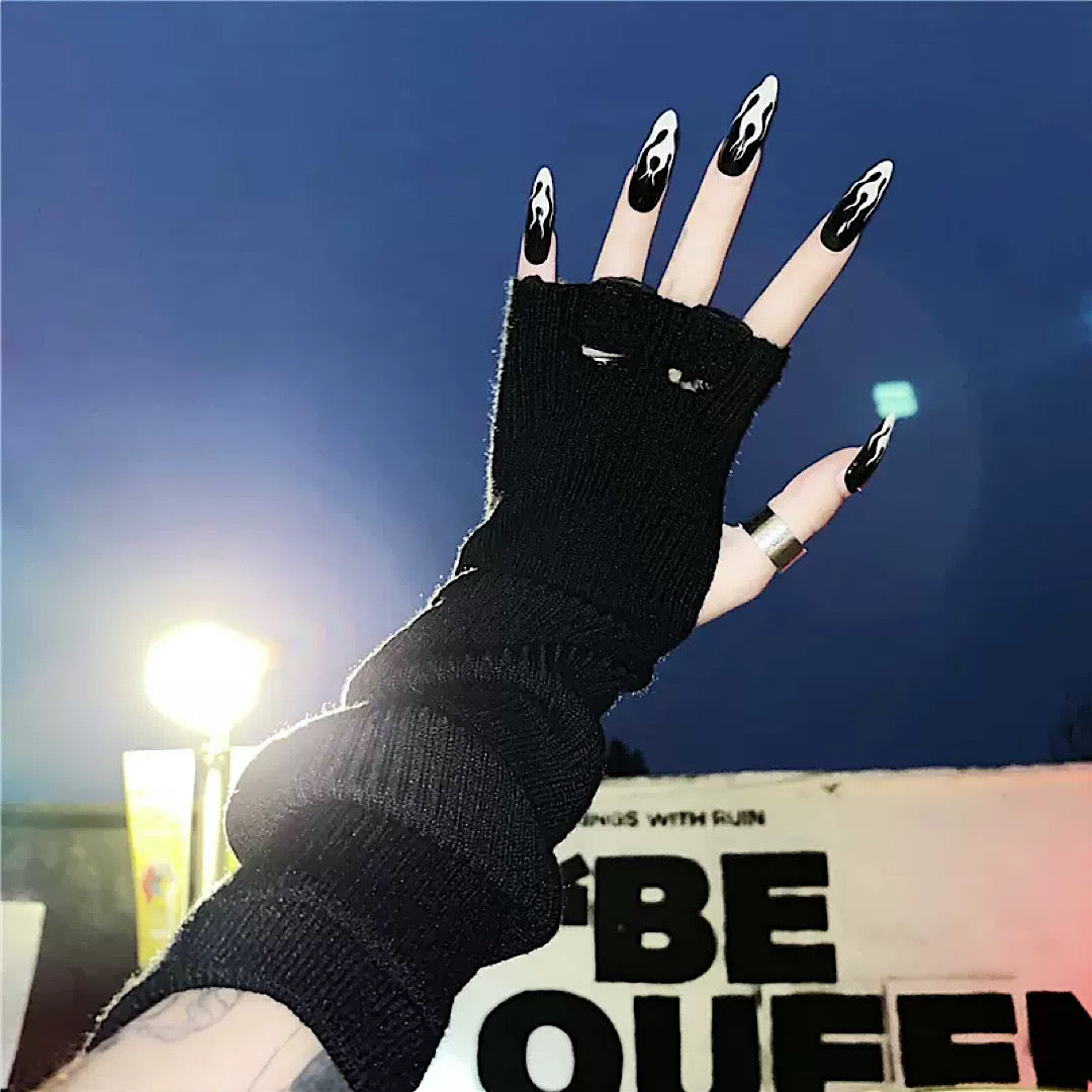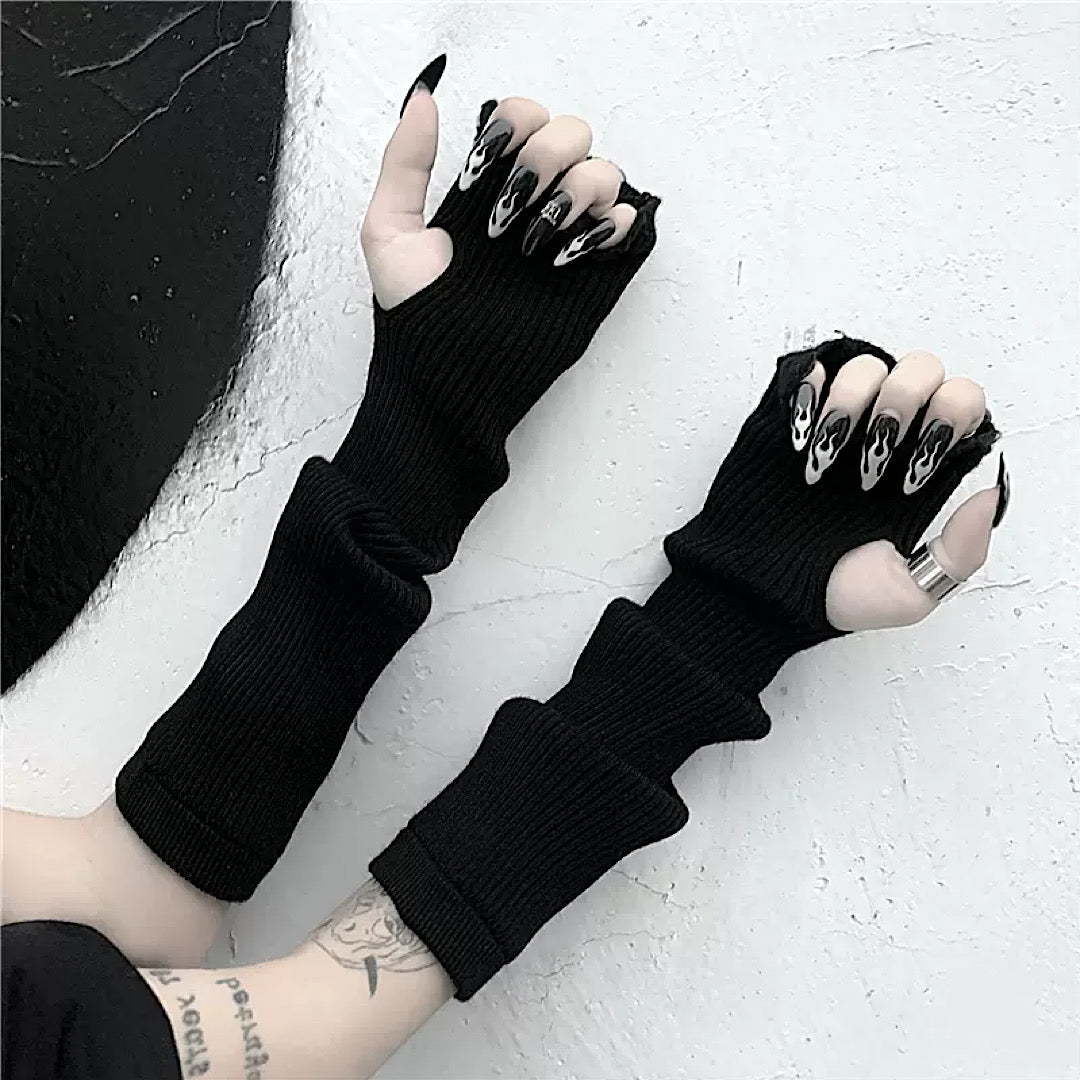Distressed arm warmers are a must-have item when your hands feel bare.