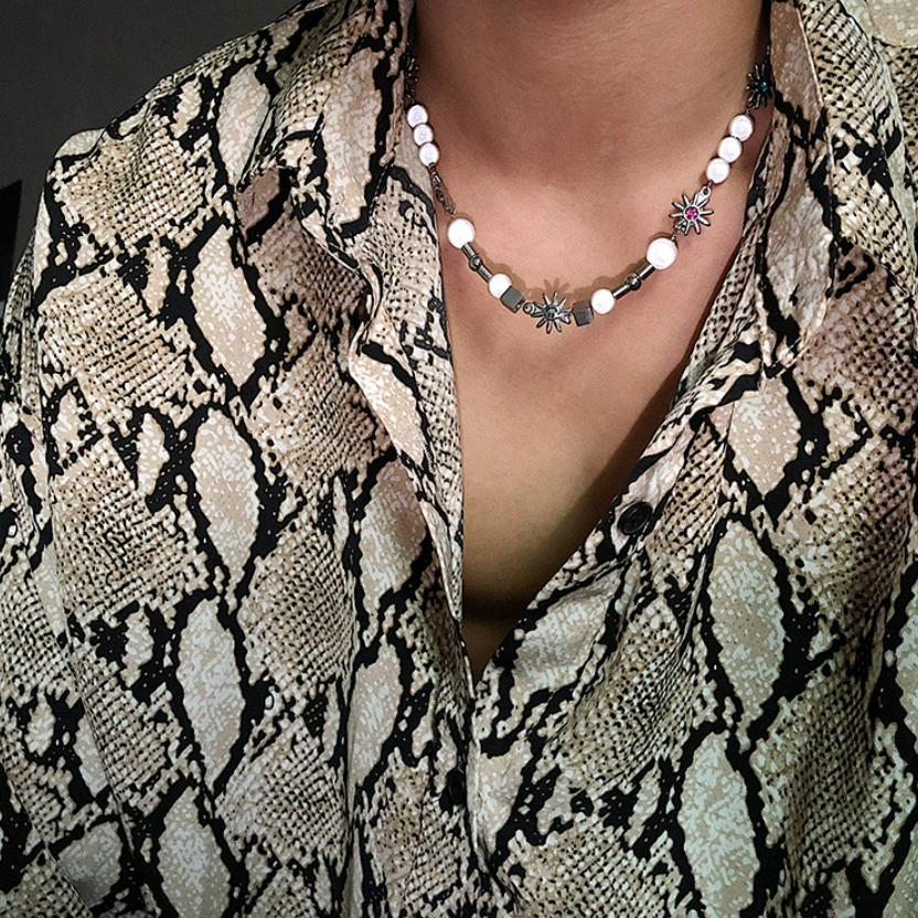 This stylish necklace features sophisticated designs such as flowers, squares, and pearls.