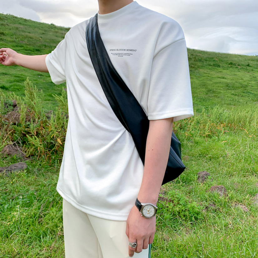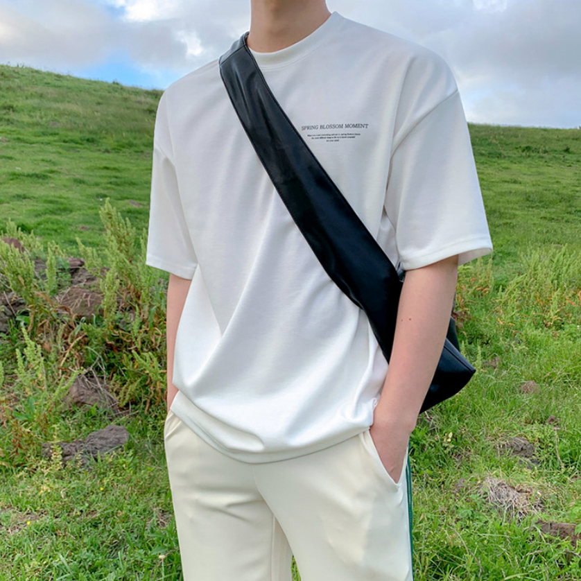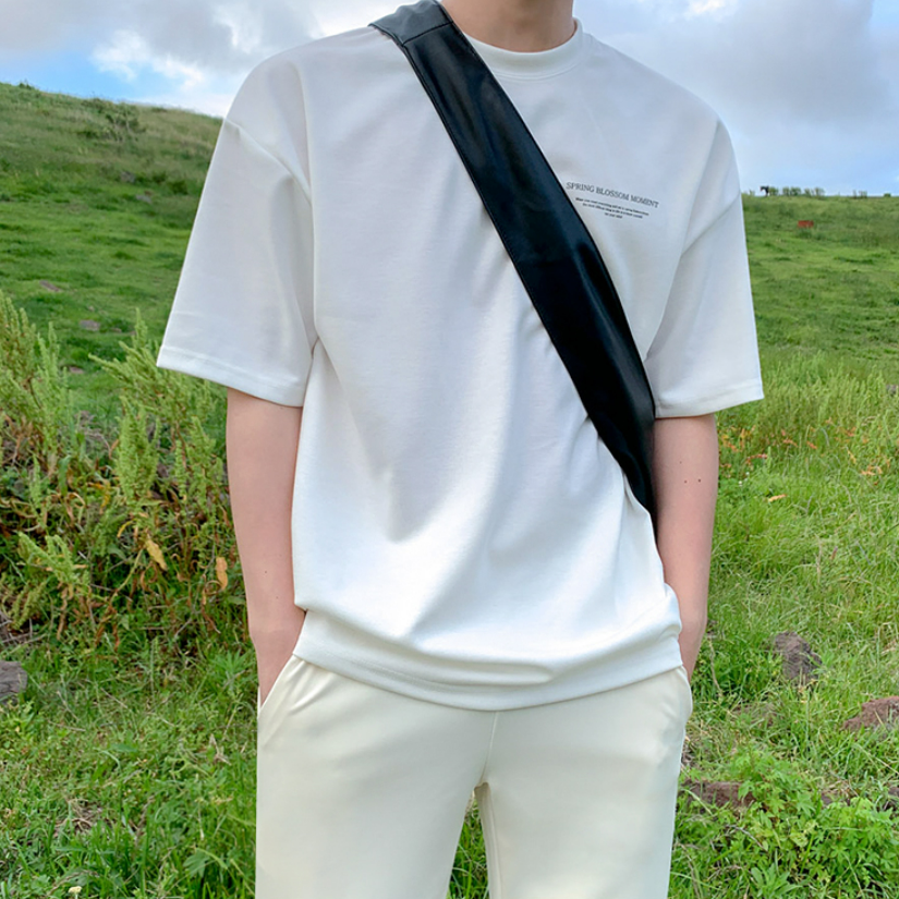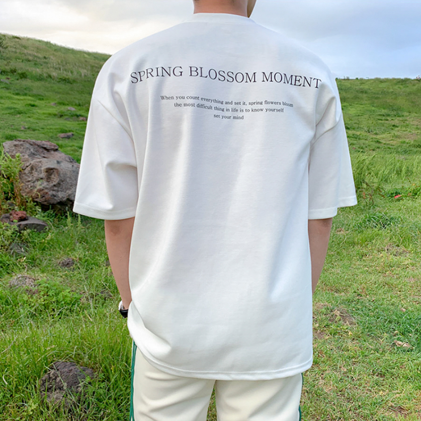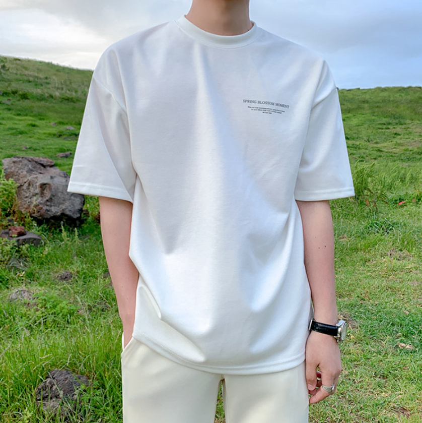 A simple white T-shirt with a subdued logo, giving it a casually playful and mature Korean look.