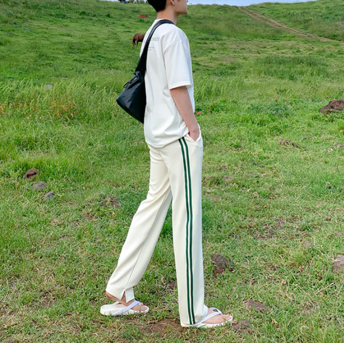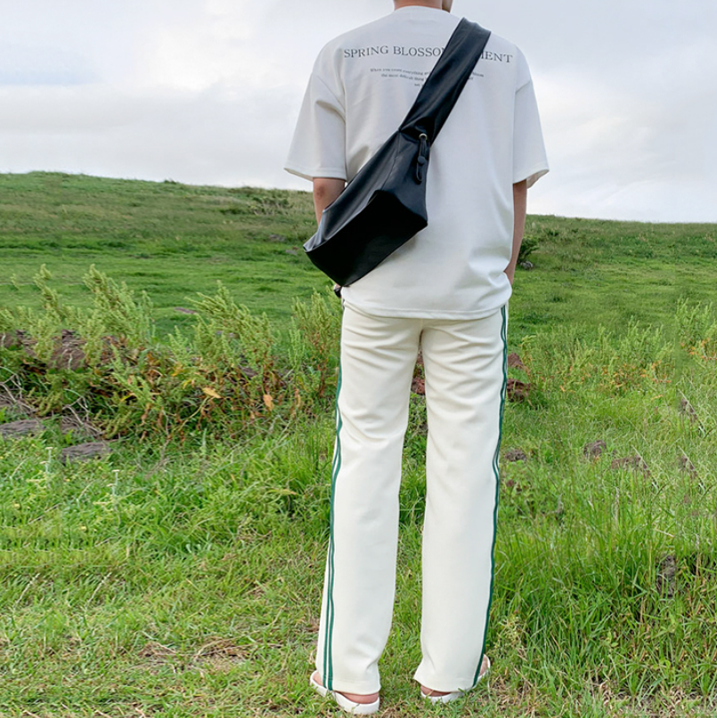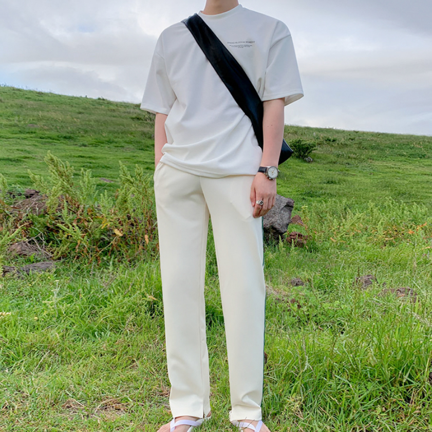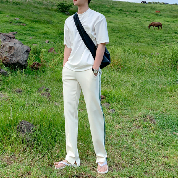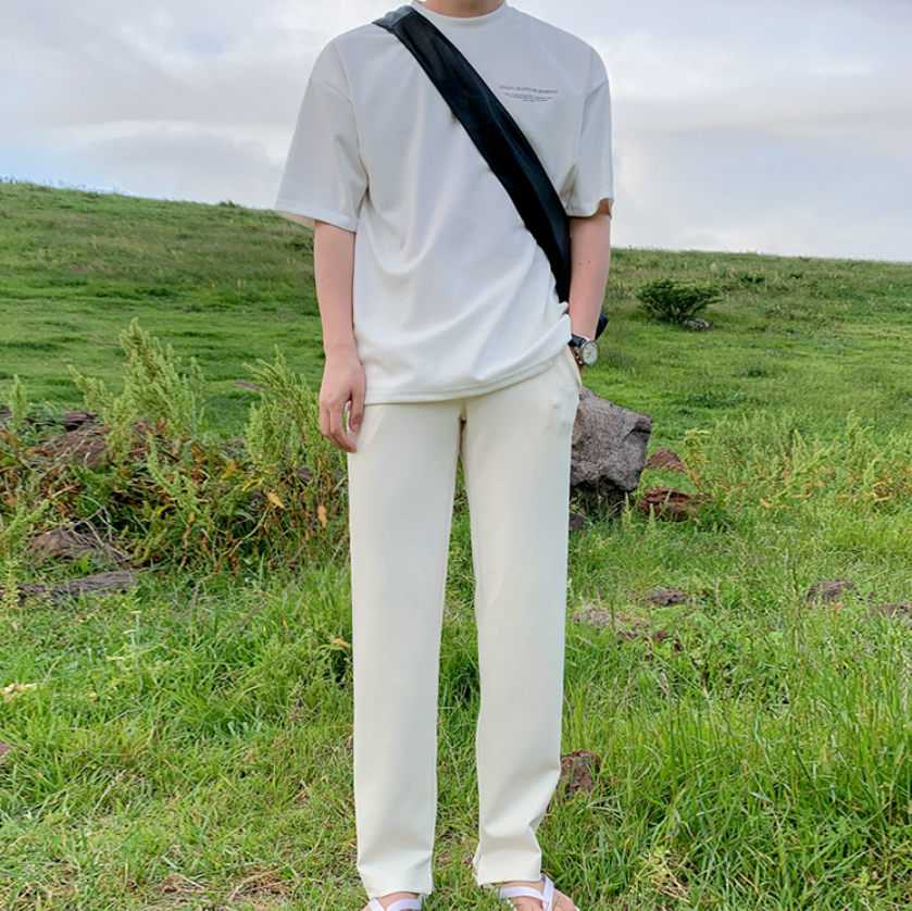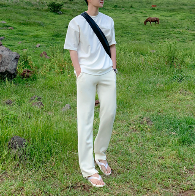 A simple white T-shirt with a subdued logo, giving it a casually playful and mature Korean look.