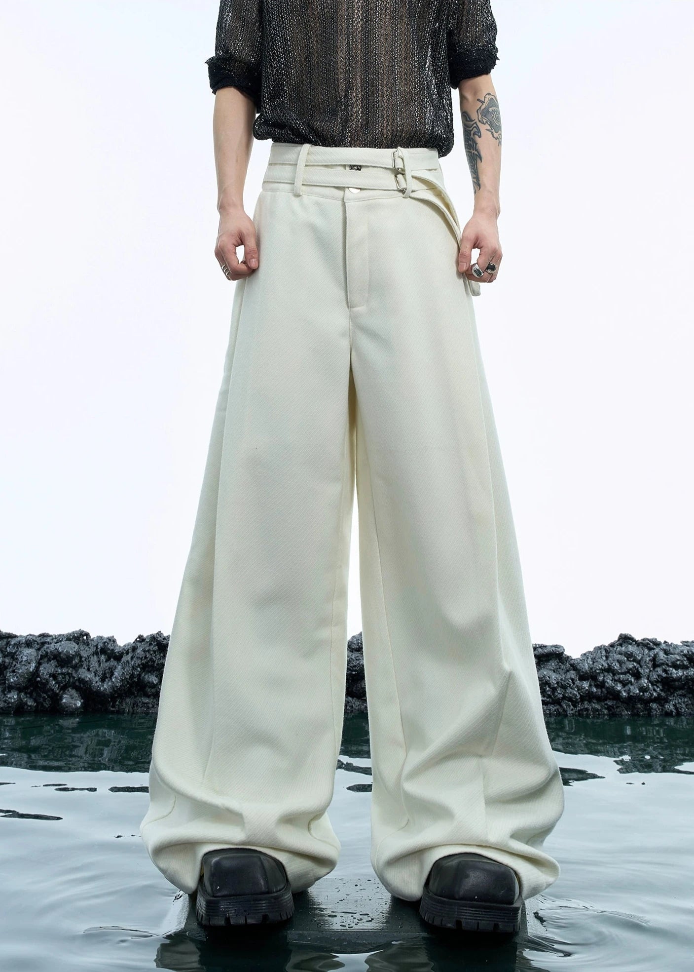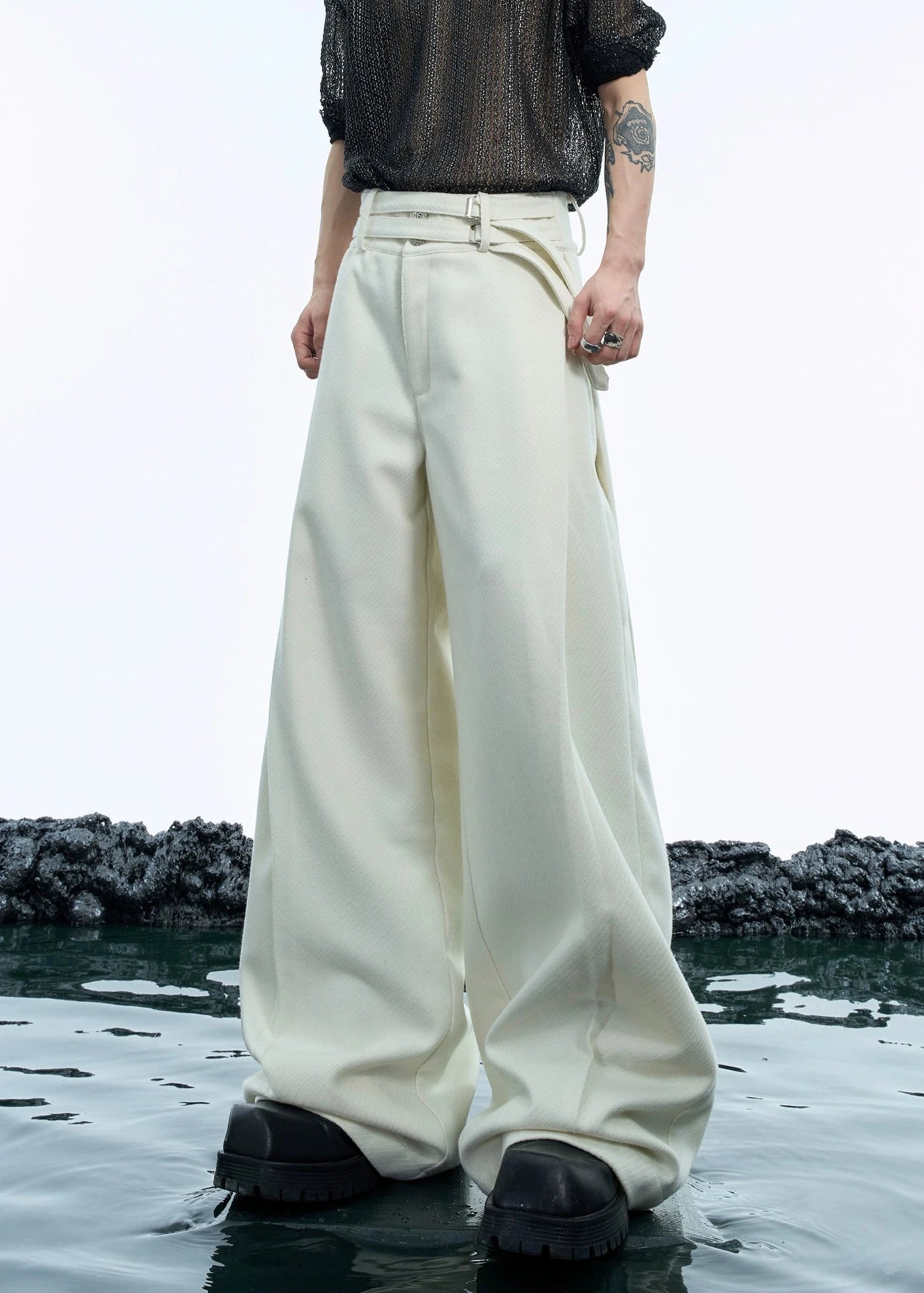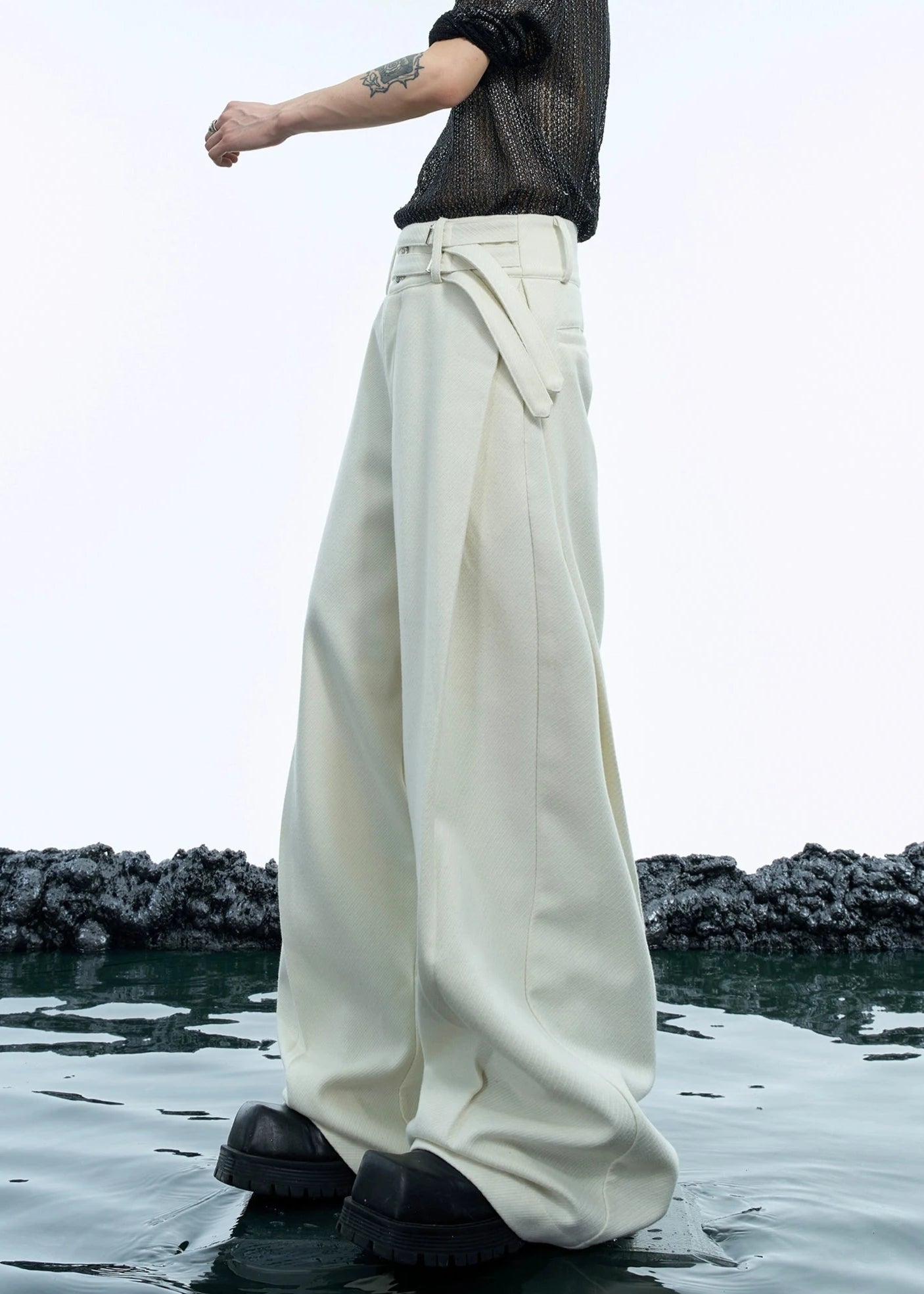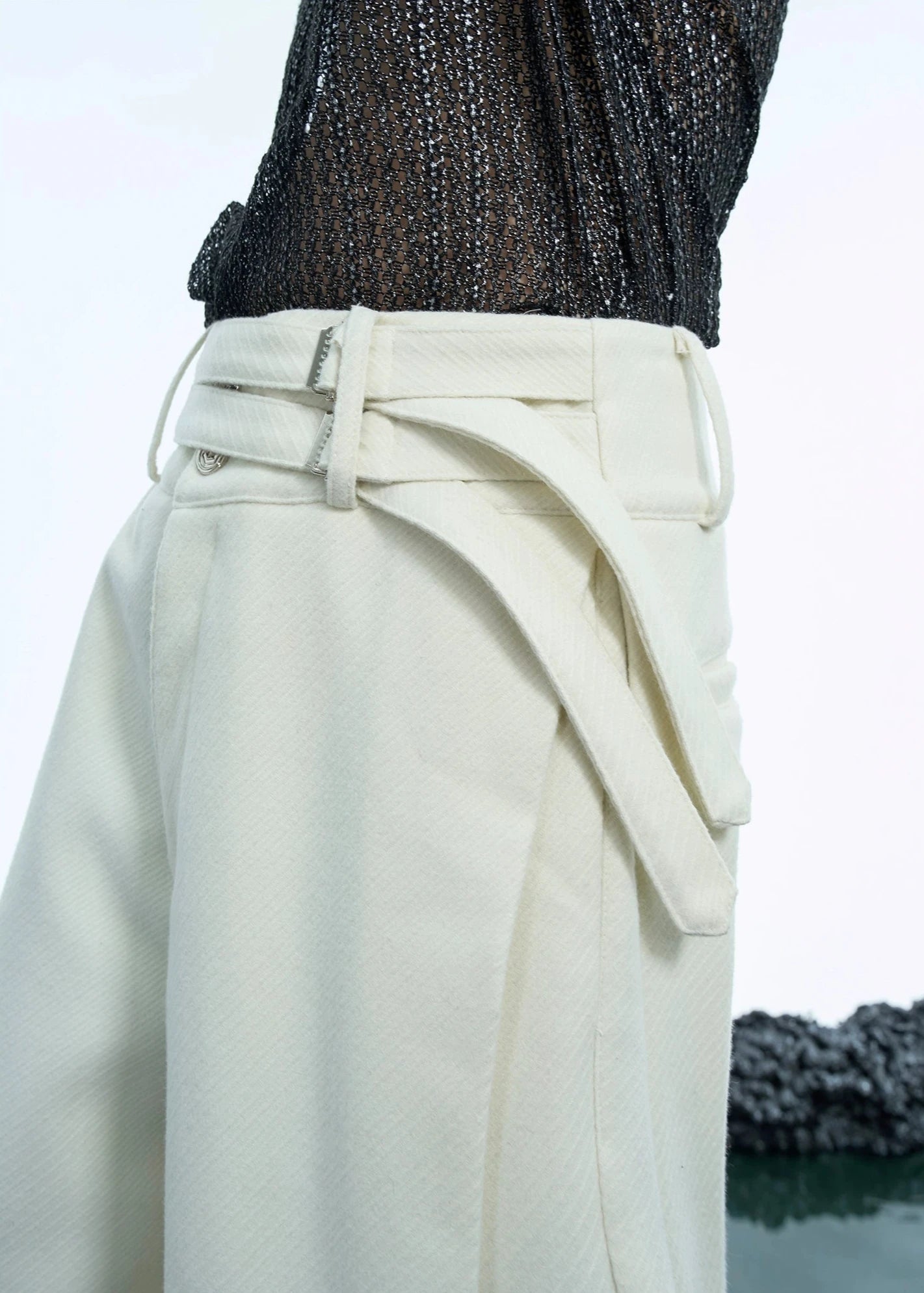セットアップのパンツ。シンプルなパンツに特徴的なベルトがポイント!