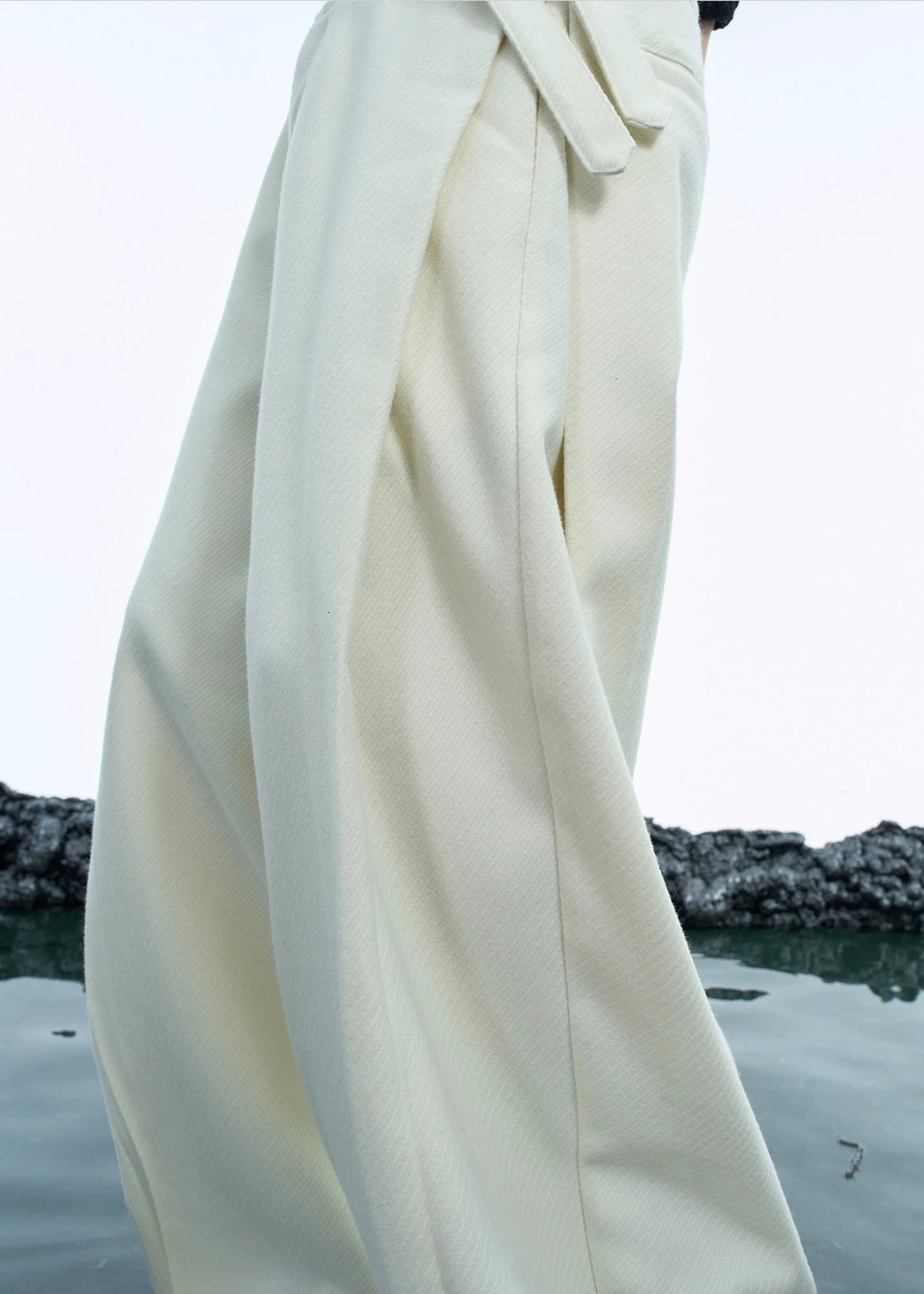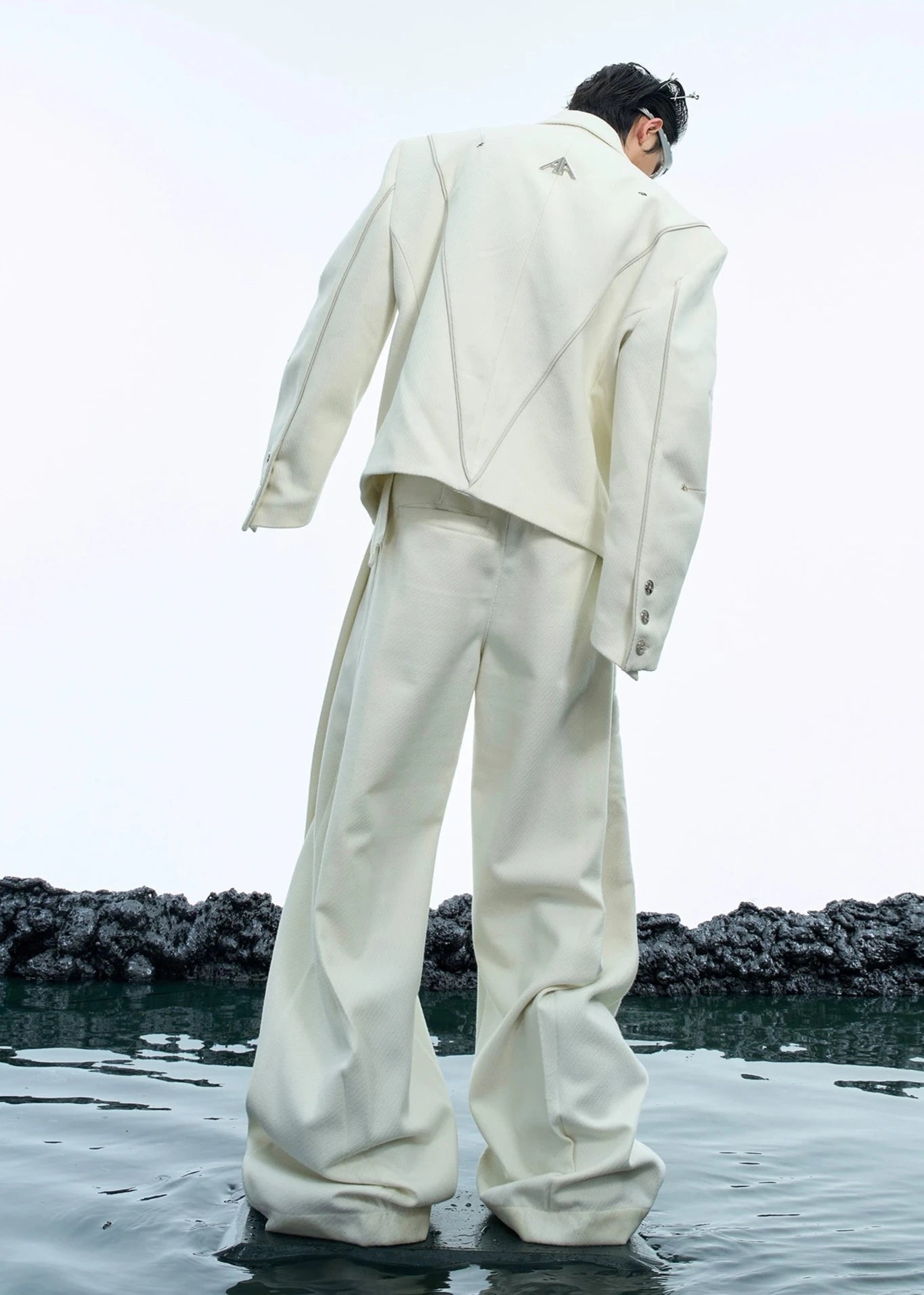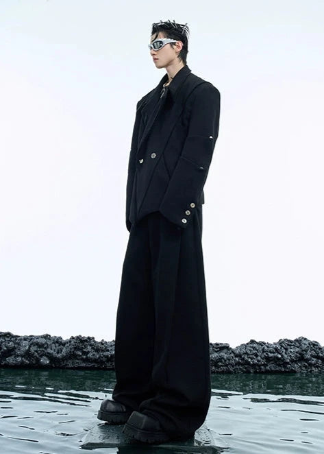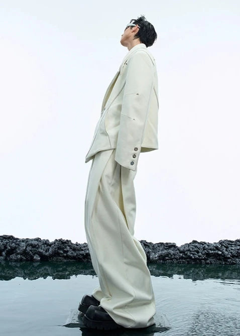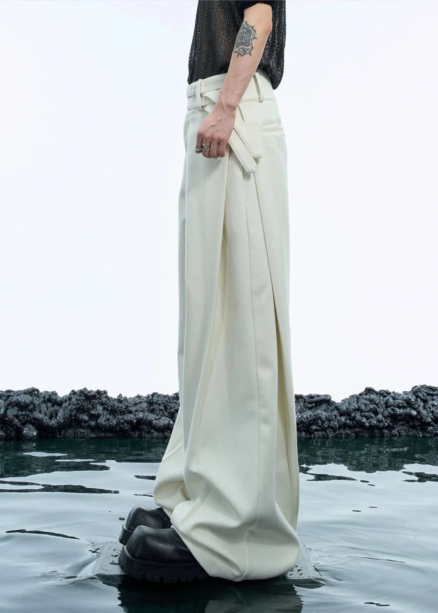 セットアップのパンツ。シンプルなパンツに特徴的なベルトがポイント!